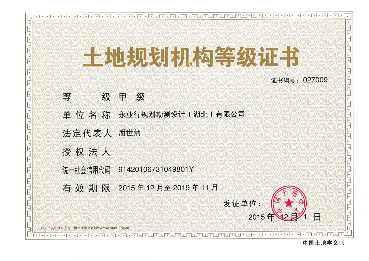 土地规划机构等级证书(甲级)