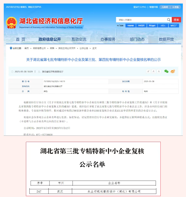 近日,湖北省经济和信息化厅发布《关于湖北省第七批专精特新中小企业及第三批、第四批专精特新中小企业复核名单的公示》,永业行旗下永业行规划勘测设计(湖北)有限公司,再次获评“湖北省专精特新中小企业”称号。截至目前,永业行已拥有两家省级专精特新中小企业。