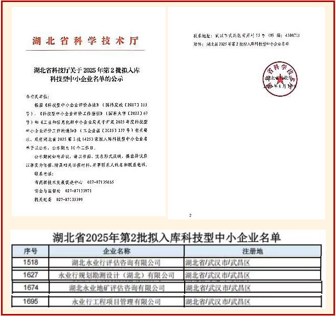 近日,湖北省科技厅公布了2025年第2批科技型中小企业入库名单,永业行旗下4家公司入选,包括湖北永业行评估咨询有限公司、永业行规划勘测设计(湖北)有限公司、湖北永业地矿评估咨询有限公司、永业行工程项目管理有限公司,4家公司均连续三年获此称号。